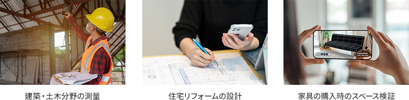 ビルや住居の建築や土木工事などで、高所や立ち入りに危険を伴う場所との距離を測定するニーズに対応します。他にも住宅のリフォーム設計、家具の購入など、ビジネスや暮らしに役立つ技術として幅広い用途への応用が可能です。