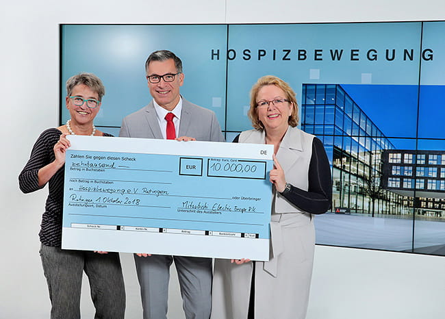 Mitsubishi Electric Europe, B.V. ドイツ支店の住環境システム部門は、地元ラティンゲンにあるホスピス「Hospizbewegung Ratingen」へ、2018年のクリスマス時期にあわせて1万ユーロを寄付しました。終末期医療を受けている方たちが尊厳をもって最後の時を迎えられるよう願いを込め実施しました。