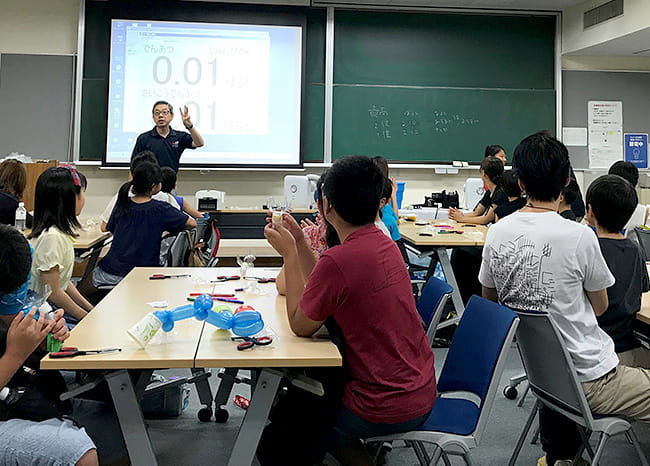 神奈川県内の拠点が合同で、神奈川県による「かながわサイエンスサマー※」に2016年から参画し、三菱電機の鎌倉研修センターで太陽光発電をテーマとした子ども向け科学教室を開催しています。教室では、若手エンジニアをはじめとする従業員が講師となり、実験やクイズを交えながら太陽電池について紹介し、子どもたちとソーラーカーを作って走らせます。