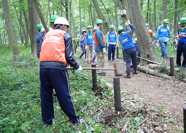 神奈川県内の5事業所※は、同県相模原市内にある「木もれびの森」の存続を目指した活動を2013年から実施しています。広葉樹の雑木林が広がるこの緑地は、全国でも珍しい都市部に隣接した平地林です。「相模原市みどりの協会」と「NPO法人相模原こもれび」のご協力のもと、美しい雑木林を維持するため、従業員ボランティアが下草刈りや間伐作業、散策路の整備を行っています。
