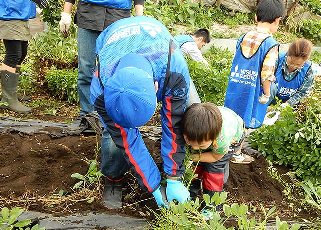 神奈川県内の5事業所※が協力して、高齢化・継承者不足によって荒廃してしまった鎌倉市内の遊休農地を耕し、農作物がよく育つ畑へと回復させる活動に取り組んでいます。地域と連携した活動を展開するため、2013年4月に鎌倉市遊休農地解消対策協議会と「鎌倉市遊休農地解消対策実践活動協定」を締結のうえ開始しました。作業では、放置されている農業用具を撤去して、膝丈まで成長した雑草を除去した後、サツマイモや枝豆などの植え付けをし、秋には収穫を行っています。