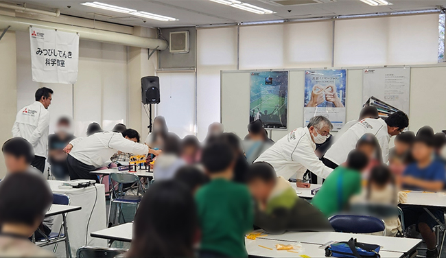 三菱電機は、公益社団法人発明協会が主催する「全日本学生児童発明くふう展」で科学実験教室を行っています。2012年からテーマを変えて毎年実施しており2024年3月には「丈夫な橋を作ろう」と題し、川に架かっている橋の構造、強度について学んだ後、軽くて丈夫なトラス橋を作り、その軽さと強さを競いました。