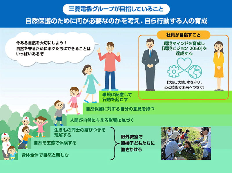 「みつびしでんき野外教室」は身近なフィールドで、参加者とリーダーとなる社員とが、共に自然を体感するもので、自然共生社会の実現に向けた「環境マインドの育成」の施策です。