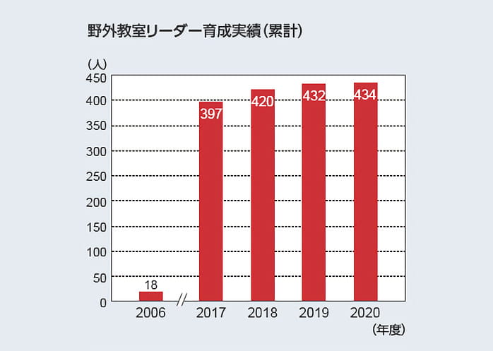野外教室の開催で大切にしているのは社員の“手づくり”ということ。「野外教室リーダー養成講座」を受講したグループ社員がプログラムを企画し、「野外教室リーダー」を務めます。