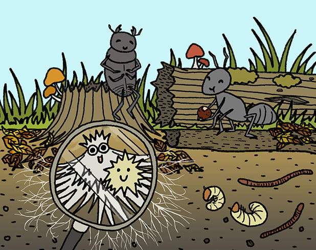 木が枯れても“いのち”の循環は続きます。落ち葉や朽ち木は虫のすみ家や食糧となり、菌類が着実に分解していきます。たくさんの“いのち”を支えながら、長い年月をかけて土に還ります。