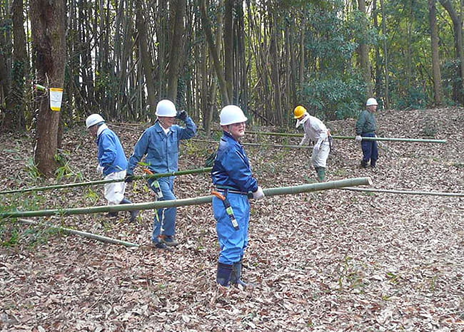 北陸支社は、石川県下の三菱グループで構成している「石川菱友会」の社会貢献活動に参画し、2009年から、能美市内でサクラ・コナラ等植栽地の下草刈りや竹林整備を行っています。地元の緑化推進委員の方にご指導いただきながら、鎌やノコギリを用いて活動に取り組んでいます。