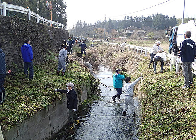 パワーデバイス製作所の熊本地区では、1981年から毎年春に、工場脇を流れる「上生(わぶ)川」の土手の草刈りと工場周辺道路の清掃作業を、関係・協力会社や取引業者の方たちと一緒に行っています。