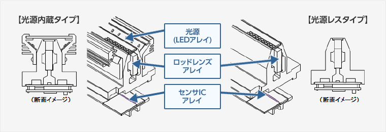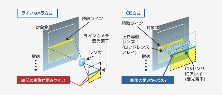 本製品は、各読取幅と同じ長さの正立等倍レンズ(ロッドレンズアレイ)を使用しています。従来のラインカメラや縮小光学系読取方式に比べ、端部の画像歪が少なく検査精度がより安定します。