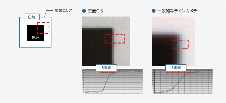 一般的なラインカメラと比較し、エッジがよりクリアに検知できるため、細かな欠陥を判別しやすいです。
