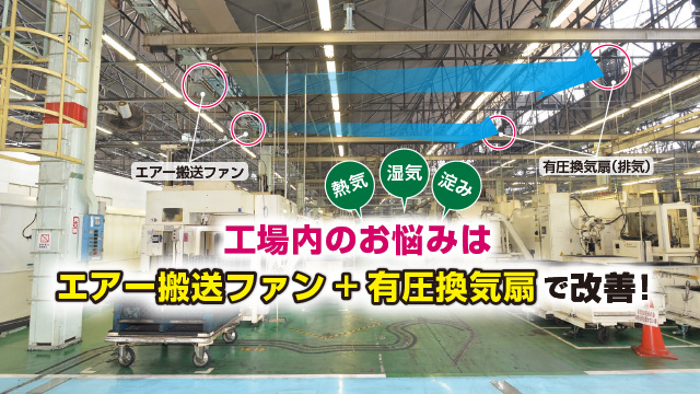 工場内の熱気・湿気・淀みのお悩みを「エアー搬送ファン+有圧換気扇」で改善