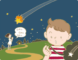 流れ星は、めったに見られないものと思われがちですが、晴れた夜、星のよく見える暗いところなら、だれでも見ることができます。海や山へ行ったときに、1時間くらい空を見ていれば、必ず流れ星を見ることができるはずです。