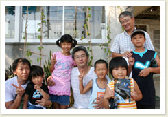 - 茎南小学校の子供たち。右端が校長の田中裕一先生。中央が石堂裕司さん、左が長女の夏葵(なつき)ちゃん。宇宙の本に夢中で「惑星に行ってみたい!」後ろは山崎直子飛行士と宇宙を旅した「宇宙アサガオ」。学校で大事に育てている。