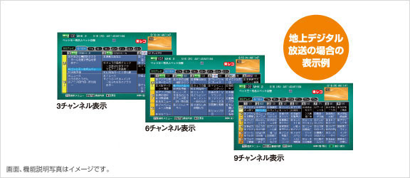 ●電子番組表(EPG)はご購入時には表示されません。●番組表の内容表示機能にGガイドを採用しています。Gガイドを利用した番組表の内容は、1日数回ホスト局(番組表の内容を取得する放送局)の放送電波とともに送信されてきます。●番組内容を取得するためには電源を「切」にしておく必要があります。取得時間は最大で約1時間程度かかることがあります。ホスト局を受信できない地域では、番組表は利用できません。ホスト局の受信状態が良くないときは、番組表の内容の一部が取得できないことがあります。該当する地域コードの一覧表に載っていない放送局は、放送が受信できる場合でも番組表が利用できないことがあります。●番組表の表示機能にGガイドを採用していますが、当社がGガイドの電子番組表サービスを保証するものではありません。●CATV側で放送局の電波を改変せずに再送信している場合は、番組表(アナログ放送のみ)を利用できます。利用できない場合は、ご利用のCATV会社に電波を改変せずに再送信しているか、お問い合わせください。●製品の定格、デザインおよび操作画面は、改善等のため予告なく変更する場合があります。 ●Gコード予約:雑誌・新聞のテレビ欄などに掲載されているGコード番号を入力するだけで録画予約がおこなえます。●Gガイド、G-GUIDE、およびGガイドロゴは、米Gemstar-TV Guide International, Inc.の日本国内における登録商標です。Gガイドは、米Gemstar-TV Guide International, Inc.のライセンスに基いて生産しております。米Gemstar-TV Guide International, Inc.およびその関連会社は、Gガイトが供給する放送番組内容及び、番組スケジュール情報の精度に関しては、いかなる責任も負いません。また、Gガイトに関する情報・機器・サービスの提供または使用に関わるいかなる損害・損失に対しても責任を負いません。●Gガイド、G-GUIDE、Gガイドロゴ、Gコード、G-CODE、およびGコードロゴは、米 Gemstar-TV Guide International, Inc.またはその関連会社の日本国内における登録商標です。Gコードシステムは、米Gemstar-TV Guide International, Inc.のライセンスに基いて生産しております。 |
