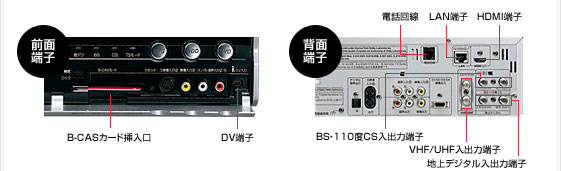 | ※1:ハイビジョン映像の美しさをそのままの画質でHDDに録画できます。ハイビジョン映像を視聴するためには、ハイビジョン対応テレビとHDMIケーブル(別売)かD端子ケーブル(別売)のどちらか一方で接続する必要があります。デジタル放送には「1回だけ録画可能」のコピー制御信号が加えられている番組もあります。※2:デジタル放送の受信には、デジタル放送チャンネルに対応したアンテナが必要です。本機は、CATV会社が地上デジタル放送を再送信する際の同一周波数パススルーおよび周波数変換パススルーのすべての周波数に対応しています。詳しくはCATV会社にお問い合わせください。CATVの受信にはCATV会社との契約が必要です。お住まいの地域や電波状態によっては地上デジタル放送を受信できない場合があります。BS・110度CSデジタル放送の有料放送を受信するためにはサービス会社との契約が必要です。詳しくはサービス会社にお問い合わせください。デジタル放送を受信するためには、付属のB-CASカードを必ず挿入してください。デジタル放送は、B-CASカードがないと、コンテンツ保護のため、スクランブルがかかって視聴、録画できません。ワンセグ放送は受信できません。●市販のソフトによっては、再生に支障をきたす場合があります。その際はお客さま相談センターにお問合わせください。●表示部は実際の表示とは異なります。またミラー素材採用のため、実際の見え方と異なります。●HDMI、HDMIロゴ、および High-Definition Multimedia Interface は、HDMI LICENSING LLC の商標または、登録商標です。 |
