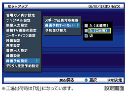 録画予約を行う前に、本編用またはCM用を選択・設定することで、本編だけの再生または、CMだけの再生をすることができます。