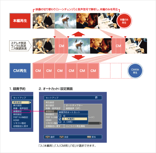 ※セットアップ画面で、予め本編再生かCM再生かを選択します。再生時に本編再生とCM再生を選択することはできません。