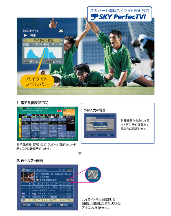 ●ハイビジョンデジタル放送を高画質でHDDに録画する場合、録画予約時「TS AUTOモード」の設定が必要です。HDDのみの機能です。TSモードでは、ハイライト再生はできません。●ハイライトシーンのみの再生に必要な時間は画面右上に要約時間として表示されます。●ハイライトシーンはレベルバー上部「ハイライトシーン」の前後約7秒間ずつを含めて連続再生されます。●リモコンの「画面表示」ボタンでグラフの表示、非表示の選択ができます。●録画した番組をDVDにダビングした場合、ハイライトレベルデータはDVDには記録されません。 |