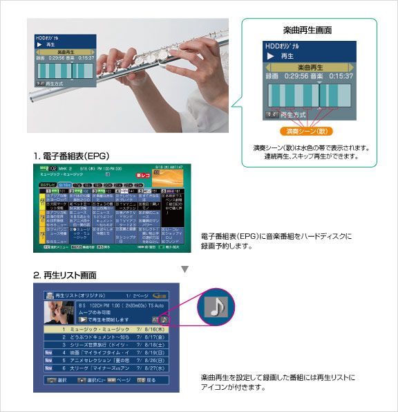 音楽番組の中で司会者や出演者の声と、演奏シーンを三菱独自の技術により解析。聴きたい演奏シーンを抜き出し、連続再生して楽しむことができます。