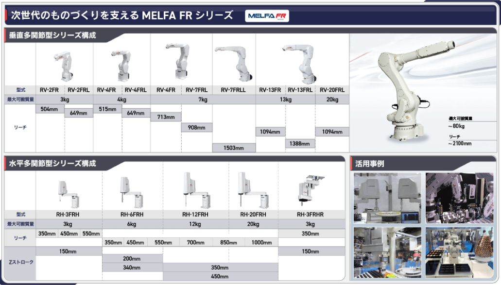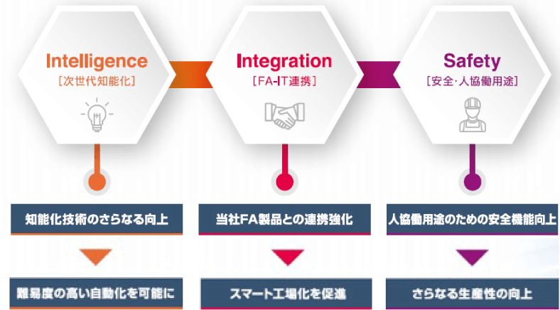 今まで自動化できなかった作業を簡単に実現する「次世代知能化機能」。次世代のものづくりを支える「FA-IT連携機能」。そして、高い安全性によって人と共に働くことを可能にした「安全・人協働用途」。FRシリーズは、この3つの柱によってあらゆる自動化ニーズにお応えします。