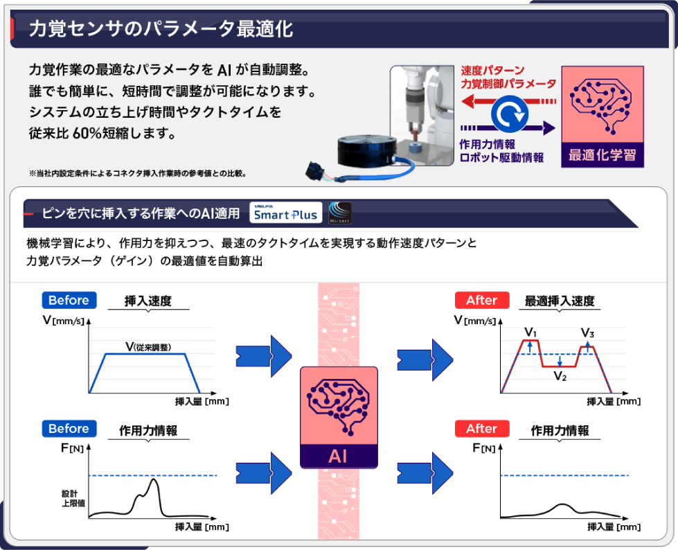 力覚作業の最適なパラメータをAIが自動調整。誰でも簡単に、短時間で様々なアプリケーションに適用可能です。また、サイクルタイムの短縮も可能であり、生産性の向上も図れます。