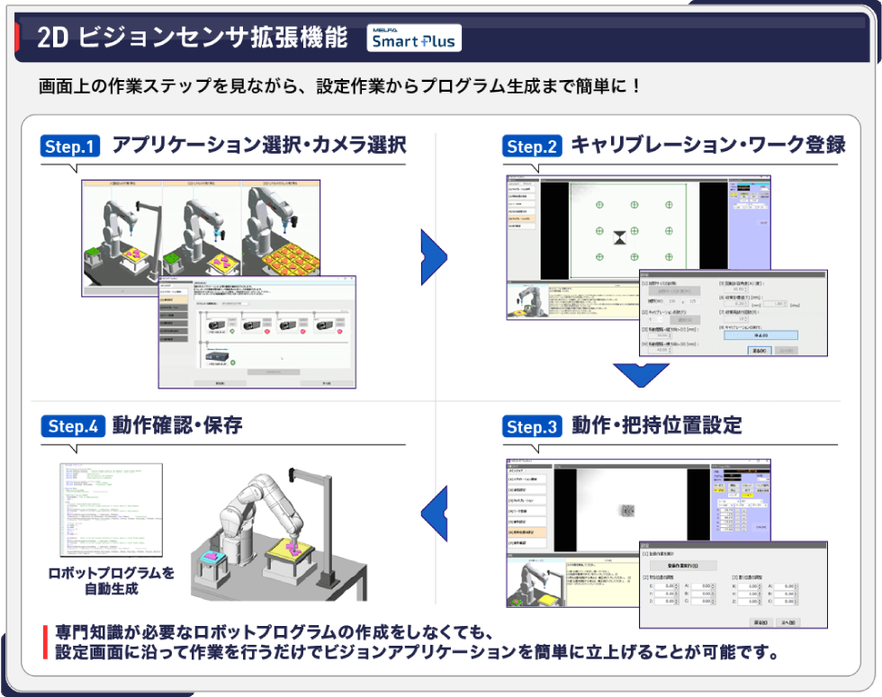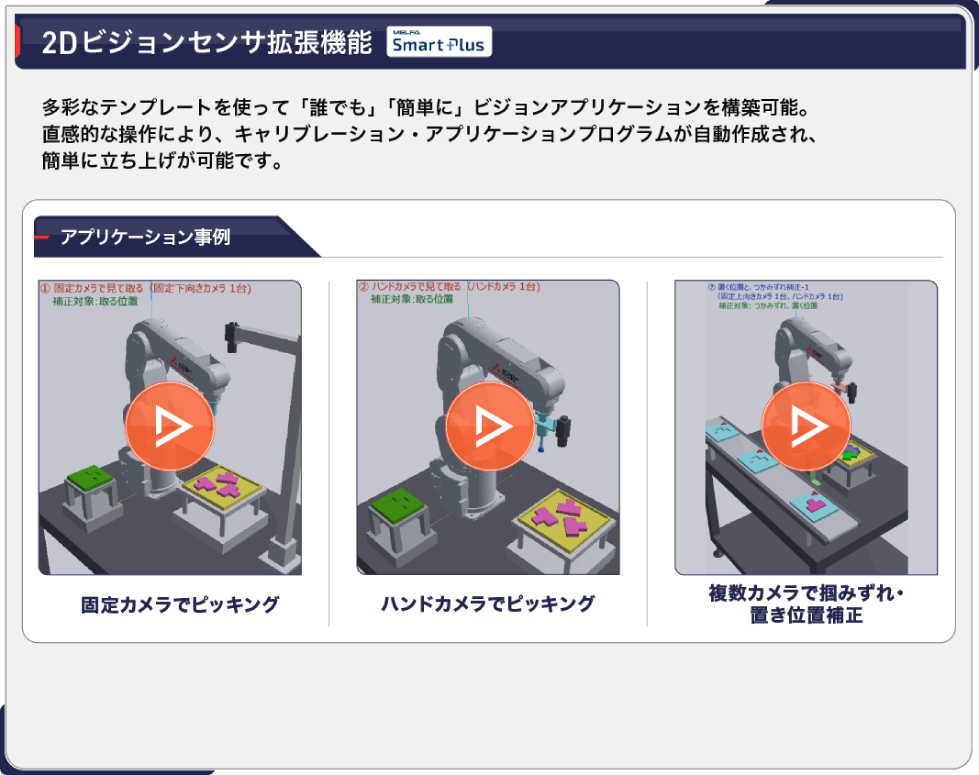予め準備されたビジョンアプリケーションから選択することにより、多彩なアプリケーションに柔軟に適用可能。その場で操作確認ができます。