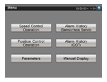 GOT2000 とセンサレスサーボを接続し、センサレスサーボの運転制御、各種データの表示、設定値の変更などを行うサンプル画面です。