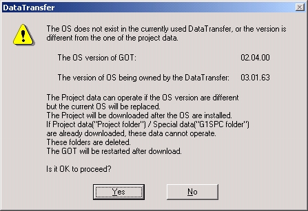 - GOT1000 のプロジェクトをダウンロード時、次のメッセージが出たときは、プロジェクトデータのOS と同じメジャーバージョンのOS をダウンロードし、データ転送ツールをインストールしたフォルダに解凍してください。