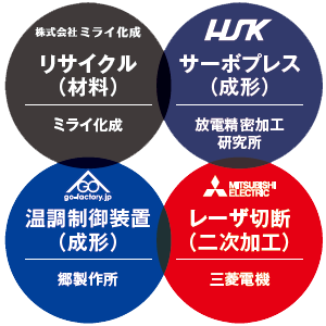 コンポジット材(炭素繊維強化プラスチック)における材料、成形から二次加工に至るまでの一連を担う最新技術として「三菱電機」「ミライ化成」「放電精密加工研究所」「郷製作所」の4社にて合同出展。