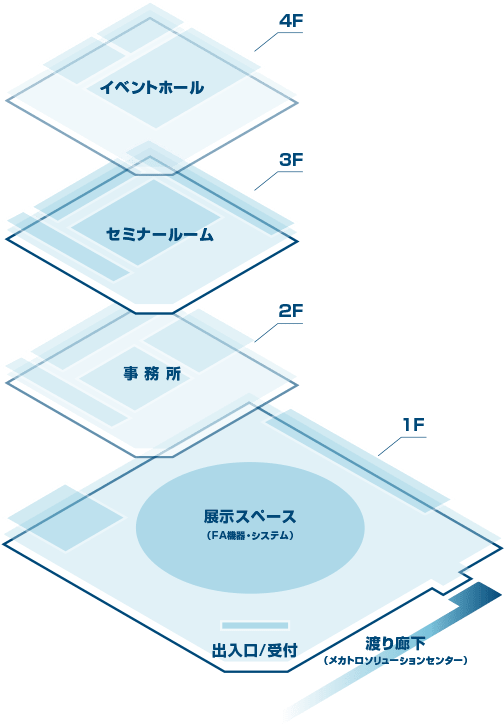 1Fの展示スペースは、三菱電機の工場自動化技術が一堂に会したショールームです。コントローラ製品・駆動制御製品・産業用ロボット・配電用制御製品など、生産現場で実際に活躍している技術を身近に体感していただけます。また、3Fにはセミナールーム(FATECトレーニングスクール)、4Fにはイベントホールがあり、たくさんの方にご利用いただいています。