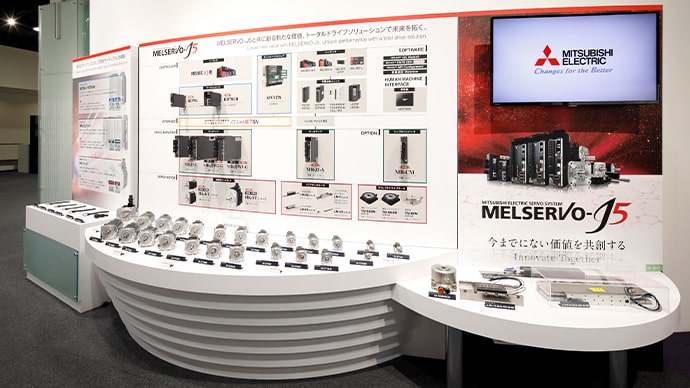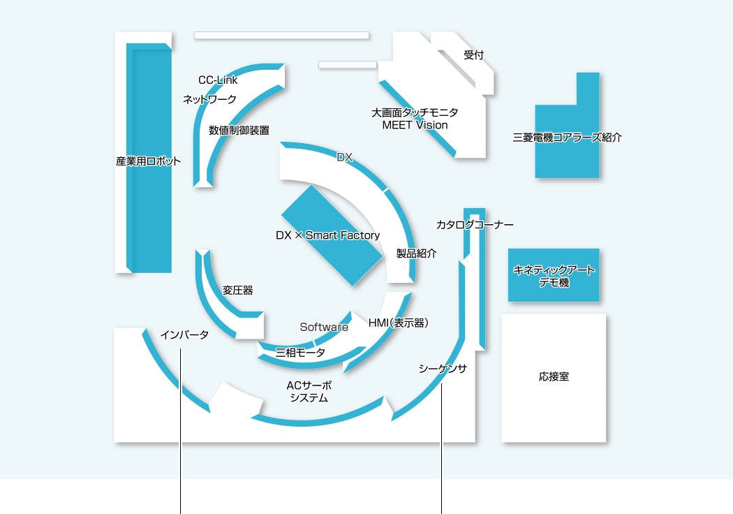 1F展示スペースでは、生産現場で実際に活躍している三菱電機の様々なFA機器やソリューションをコーナーごとに多彩に展示しています。