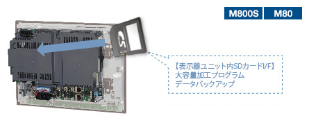 制御ユニットと表示器が一体のパネルインタイプにも、表示器背面にSDメモリカードインタフェースを装備しました。 SDメモリカードを装着いただくことで、大容量の加工プログラムを格納できます。
