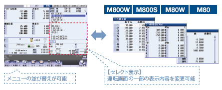 オペレータごとによく使うメニューは限られています。そんな時には、メニュー表示の並び替えや削除を行なうことで余分な操作をカット。希望の画面に簡単にたどり着けます。 また、運転画面の一部の表示内容を変更可能な「セレクト表示」機能も搭載。工具補正量やコモン変数、機械メーカ殿が作成した独自画面などを常時表示するようにすることもできます。