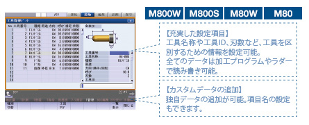 工具名称や工具IDなど豊富な設定項目を取り揃え、ラダーや加工プログラムによる読み書き・カスタムデータの追加にも対応し、より便利にお使いいただけます。