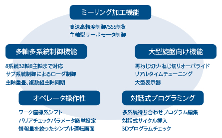 高速高精度制御やSSS制御、傾斜面加工指令への対応によるミーリング加工機能の強化や、多軸多系統制御機能の充実化など、高生産性を支える豊富な機能を搭載しました。