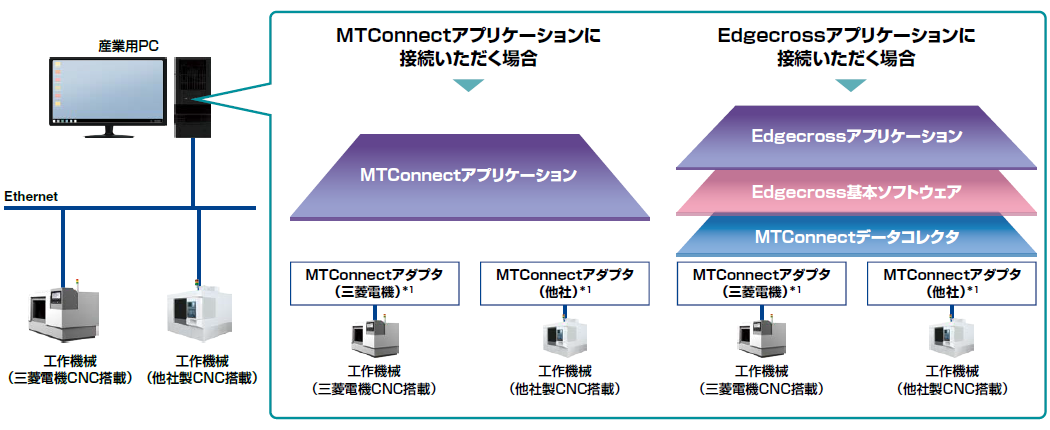 - MTConnectアダプタで収集した情報を、Edgecross基本ソフトウェア(2025年10月末に新規受注停止)に取り込み、Edgecrossアプリケーションとの接続に利用します。