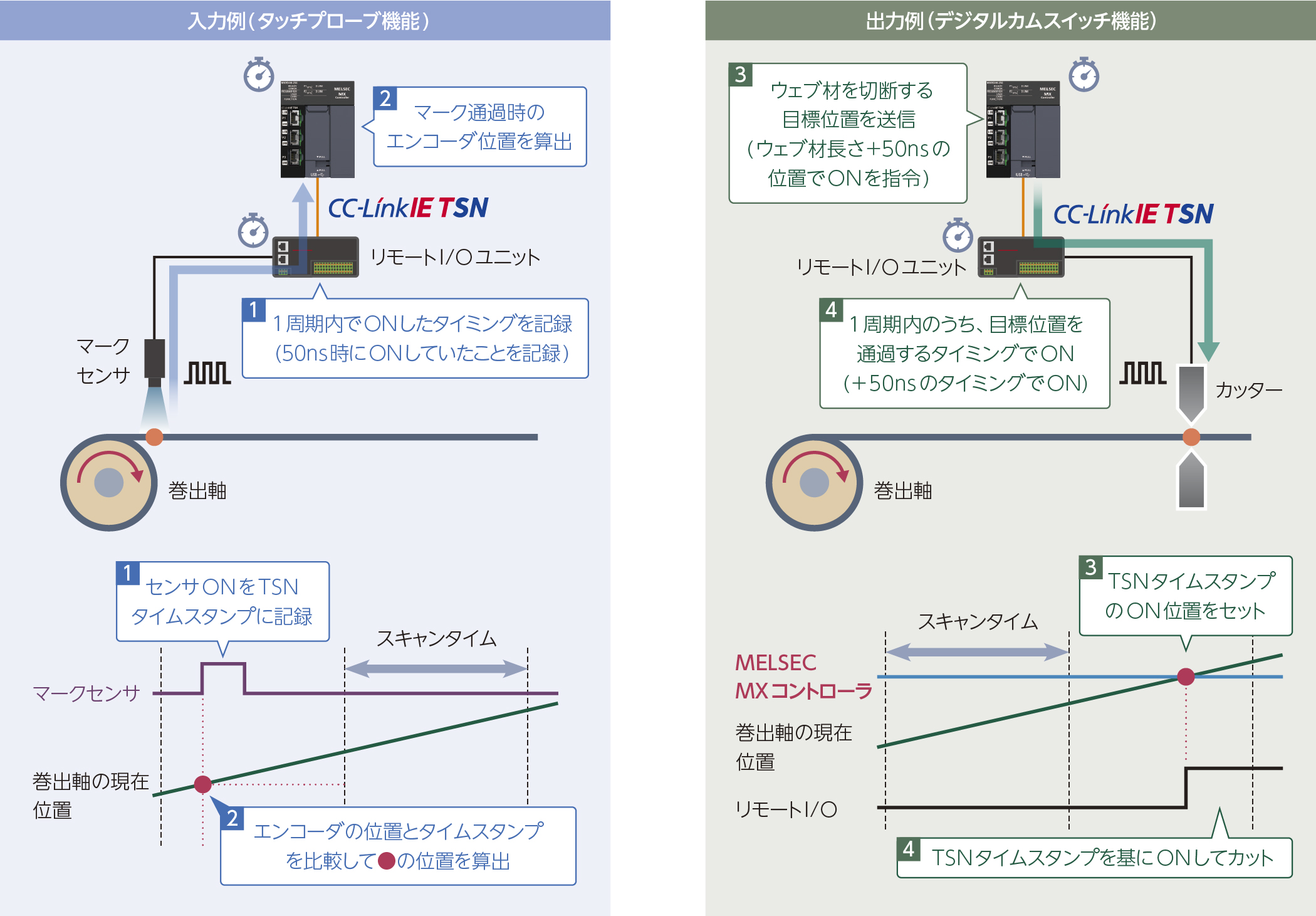 ロールtoロールなどの高速かつバラつきのないI/O制御を必要とする場合でも、コントローラのスキャンタイムに依存しない入出力がネットワーク経由で実現できます。マークの検出とカッティングの入出力タイミングの誤差(ジッタ)が小さいため、ウェブ材の検出とカット長のバラつきを低減できます。高速でワークが流れる製造ラインの歩留まりを向上できます。