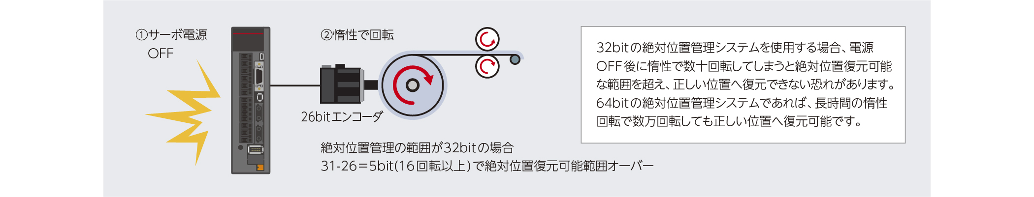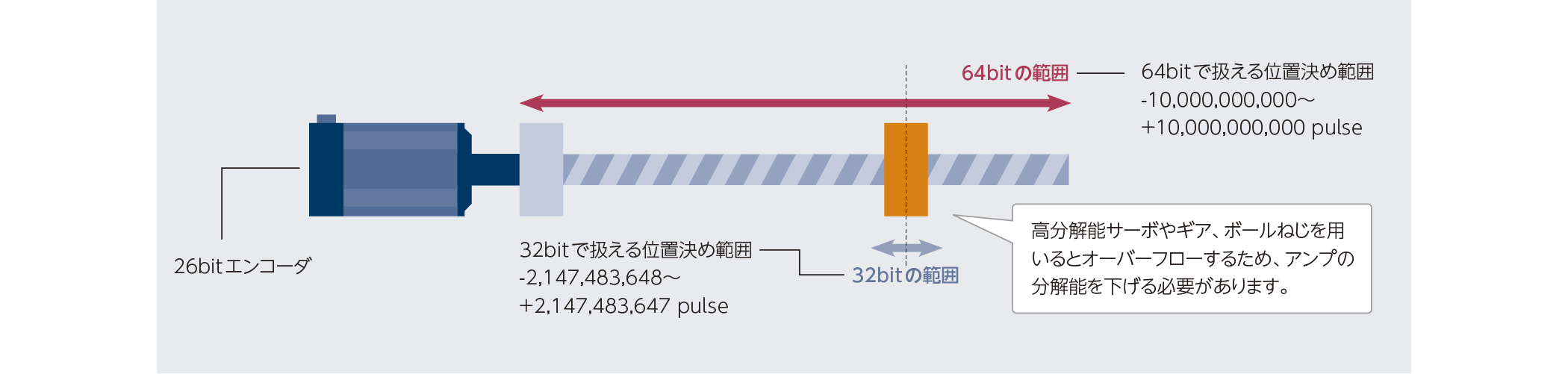 32bitの従来品と比較して、高分解能を維持しつつ、位置決め範囲を広く設定できます。