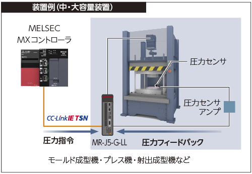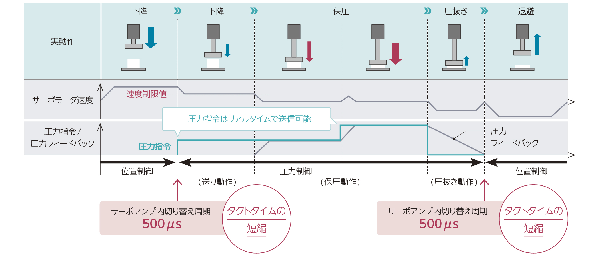 サイクリック圧力制御モード(cspr)に対応したMR-J5-G-LLと組み合わせることで、ファンクションブロックの圧力指令に応じた圧力のフィードバック制御をサーボアンプが行います。圧力制御ループはコントローラを介さないため、高速・高応答です。