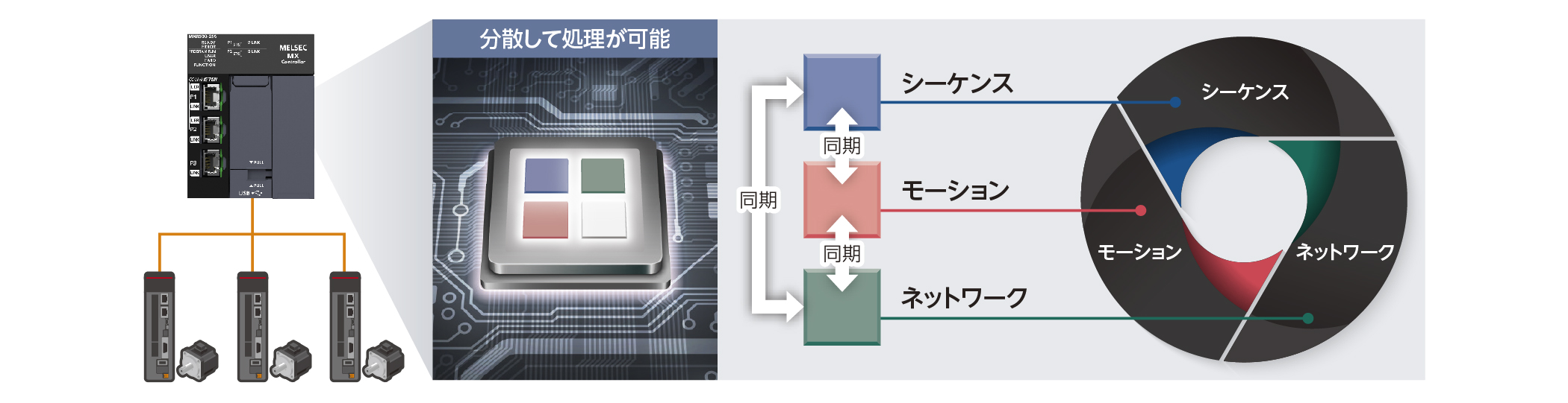 高速マルチコアMPUの採用で、倍精度浮動小数点などの処理性能が大きく向上。MPUコア間の相互通信により、複数のコアが同時に異なるタスクを処理できるため、シーケンス制御/モーション制御/ネットワーク制御の高速並列処理を実現します。各コアの分散制御で、システム全体のタクトタイム短縮にも貢献します。