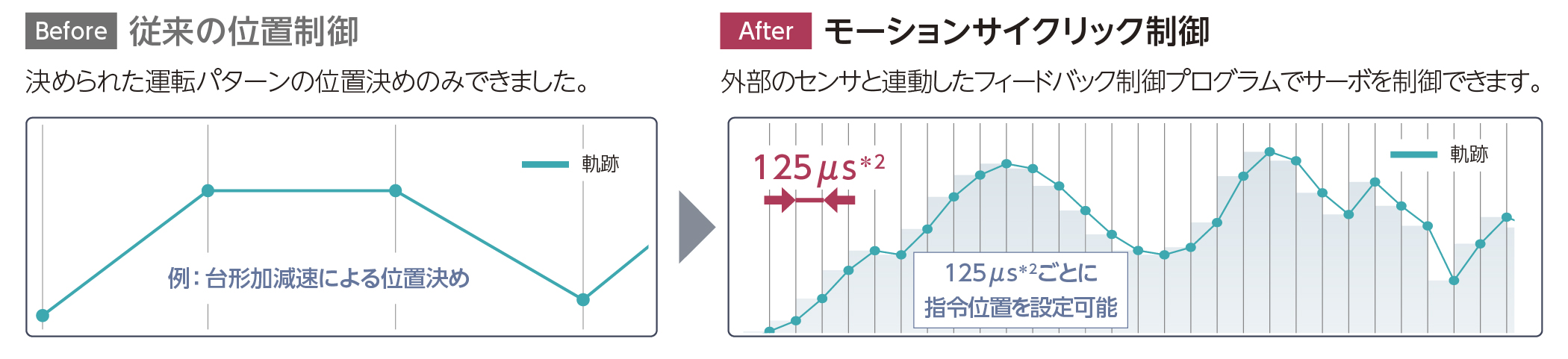 - ●通常の位置決め運転に加えて演算周期ごとに目標トルク、位置、速度を送信可能なモーションサイクリック制御に対応