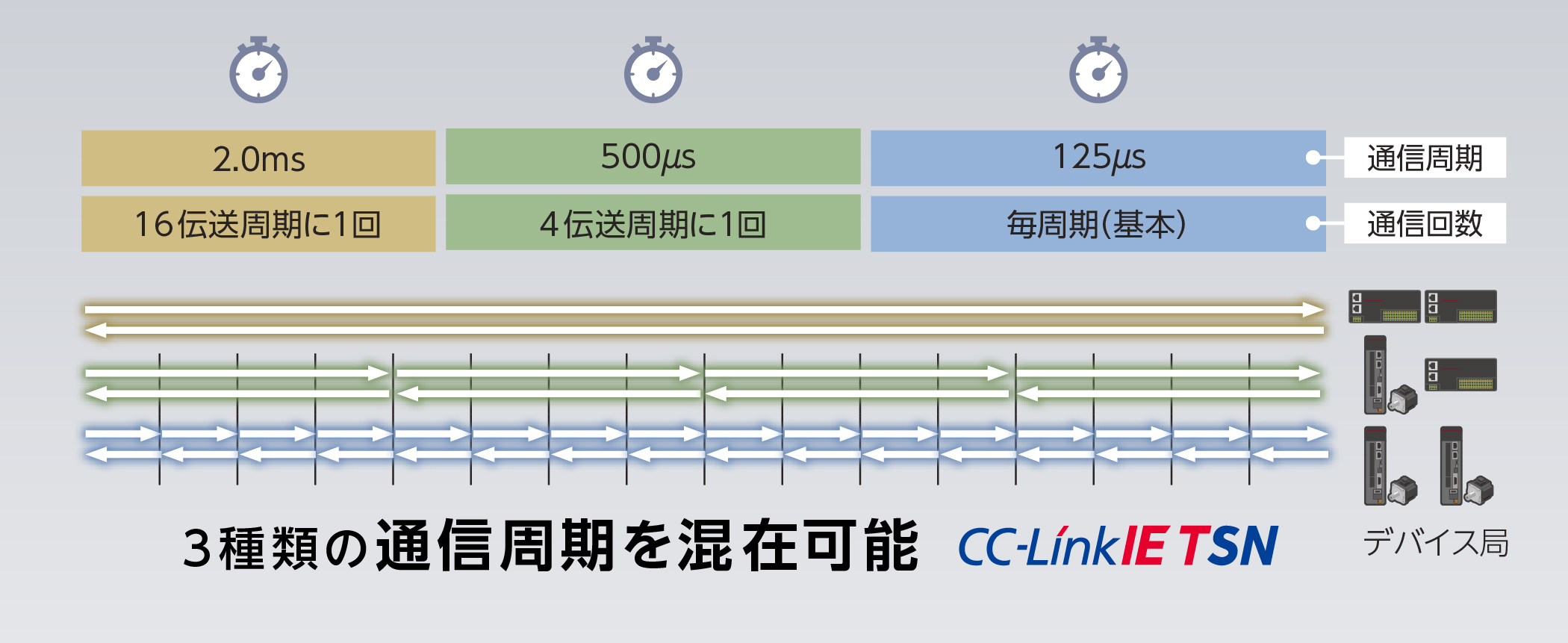 高速リンクスキャンによるタクトタイムの大幅短縮を実現。また通信周期混在も可能なため、デバイス局数が多くても高速・軽量な通信を保証できます。