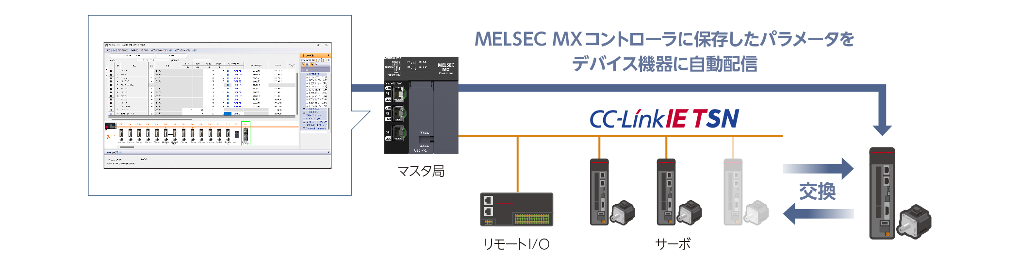 電源ON時や復列時に、マスタ局に保存したパラメータをデバイス機器へ⾃動で配信します。デバイス機器を交換した後でも、個別のパラメータ書込みは不要でスムーズに交換できます。
