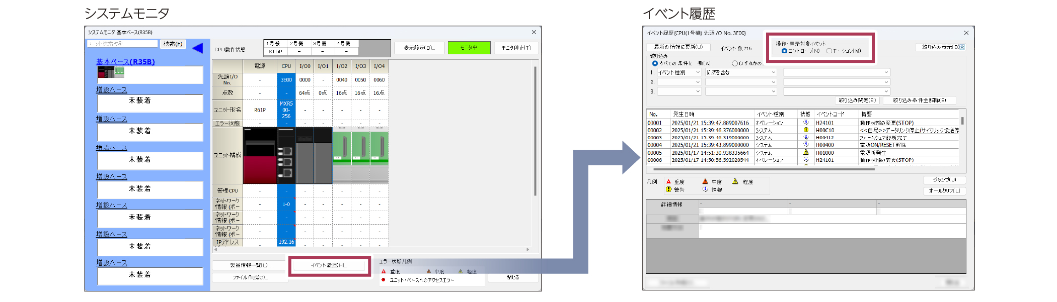 GX Works3の診断機能を使用することで、異常箇所を容易に特定できます。システムモニタでは、システムのユニット構成やエラー状態などを確認できます。イベント履歴表示では、コントローラやモーションで発生したエラーや実行した操作を時系列で確認できます。エラーの詳細情報、原因、処置方法も表示されます。