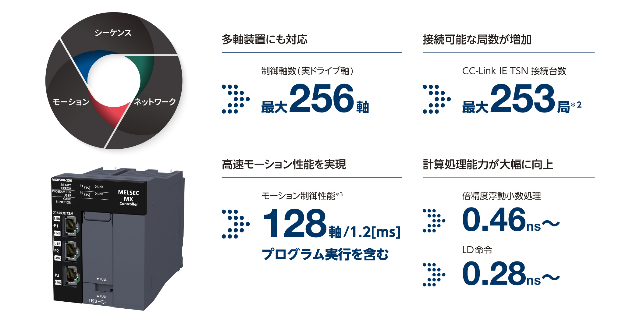 シーケンス/ モーション/ ネットワークの3つの制御を一体化した高性能マルチコアMPUを標準搭載し、最大256 軸の多軸制御を実現。演算周期の混在ができ、多軸でも高速演算周期による制御が可能です。各機構の細かな制御から製造ライン全体の制御まで、コントローラ1 台で対応できます。