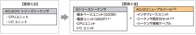 A0J2(H)シリーズをQシリーズへ置き換えるためのツールです。既設ユニットの配線端子台をそのまま装着できるインタフェースユニットと既設取付け穴を活用するためのベースアダプタなどで構成されます。