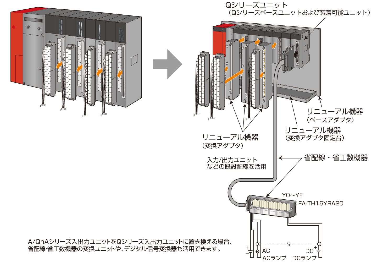 ユニットの仕様などにより、ユニット単体での置換えが困難な場合は、外部に省配線・省工数機器を活用することで、システムの置換えが容易になります。