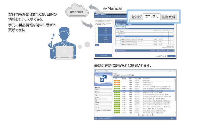 従来はWebサイトから目的のカタログやマニュアルなどを探すのに手間がかかりましたが、分類ごとに整理されているのですぐに最新情報を入手できます。 また入手した情報が更新されたときにも通知があり、簡単に情報をアップデートできます。是非、e-Manual Viewerをご利用ください。