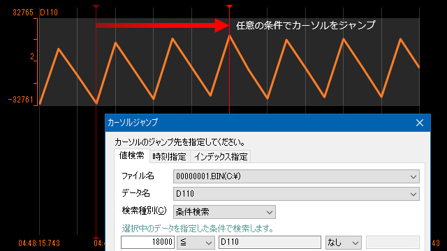 値検索・時刻指定は、カーソルジャンプ機能で任意の条件でカーソルをジャンプさせて、異常発生箇所をすばやく確認できます。
