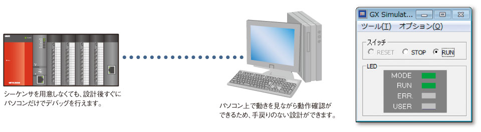 パソコン上で、簡単にプログラムの動作確認ができます。