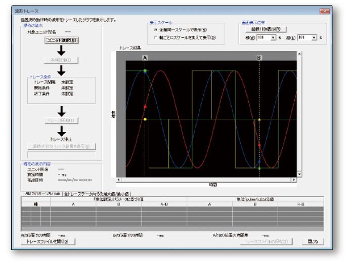 位置決め運転時の速度指令(軸速度)や2軸補間制御、同時始動(2軸)の状態をトレースしグラフ化します。